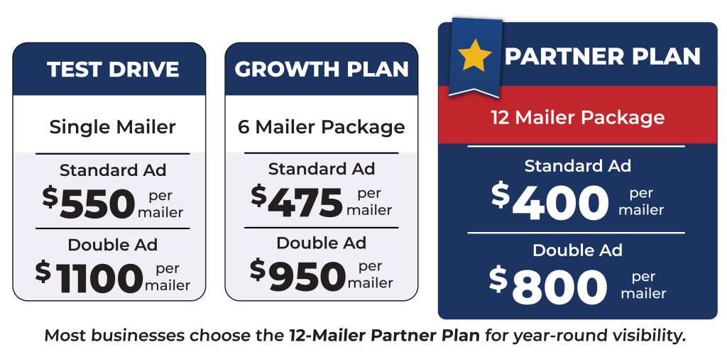 A curated mix of trusted local businesses on one mailer boosts credibility. Residents feel a sense of community support which creates powerful social proof and increases the chance your offer is used.